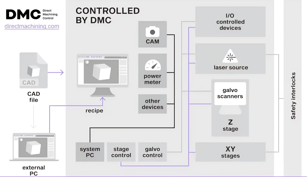 一體化解決方案,用戶可以在軟體上創建或導入CAD 檔案、設置參數和點擊“執行”。DMC 軟體負責所有硬體的控制。